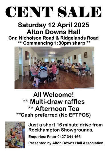 A Cent Sale will be held at the Alton Downs Hall at 1:30pm on the 11-4-2026.